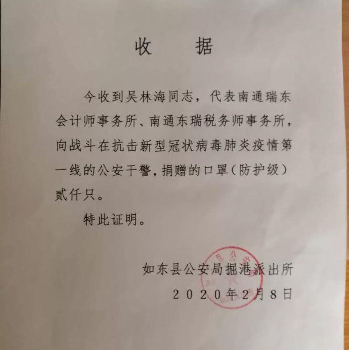 2020年2月8日,協(xié)會會員單位——南通瑞東會計師事務(wù)所有限公司向戰(zhàn)斗在抗擊新型冠狀病毒肺炎疫情第一線的如東公安干警捐贈口罩2000只。