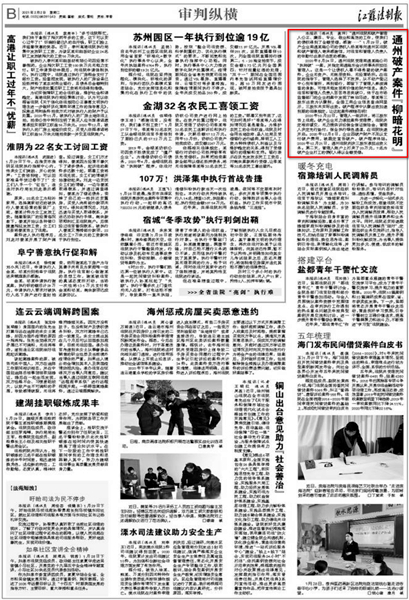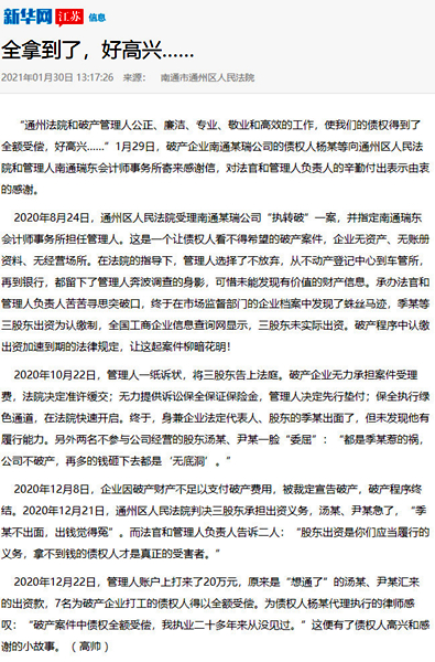 江蘇法制報截圖 近日“南通瑞東會計師事務(wù)所”的名字,不斷出現(xiàn)在《新華網(wǎng)》《江蘇法制報》的報道之中。一個小會所名字出現(xiàn)到主流新聞媒體中,實(shí)屬罕見。這要從我所承辦的一起破產(chǎn)案件說起。 2020年8月24日,通州區(qū)人民法院受理南通某瑞公司“執(zhí)轉(zhuǎn)破”一案,并指定南通瑞東會計師事務(wù)所擔(dān)任管理人。這是一個典型的企業(yè)無資產(chǎn)、無賬冊資料、無經(jīng)營場所的三無企業(yè),債權(quán)人看不到任何受償希望的破產(chǎn)案件。 南通瑞東會計師事務(wù)所由多名專業(yè)人員組成的清算組,主任會計師吳林海親自帶隊(duì)。在承辦法院的指導(dǎo)下,管理人從不動產(chǎn)登記中心到車管所,再到銀行,四處奔波,全方位開展資產(chǎn)調(diào)查工作,可惜仍未能發(fā)現(xiàn)有價值的財產(chǎn)信息。管理人團(tuán)隊(duì)苦苦尋思突破口,仔細(xì)尋找蛛絲馬跡,終于在稅務(wù)局申報表和市場監(jiān)督部門的企業(yè)檔案中發(fā)現(xiàn)了有益線索。原來債務(wù)人公司季某等三股東出資為認(rèn)繳制,全國工商企業(yè)信息查詢網(wǎng)顯示,三股東均未實(shí)際出資。根據(jù)企業(yè)進(jìn)入破產(chǎn)程序股東認(rèn)繳出資加速到期的法律規(guī)定,讓這起案件柳暗花明! 2020年10月22日,管理人一紙訴狀,將三股東告上法庭在申請訴訟保全后,債務(wù)人企業(yè)無力提供訴訟保全保證保險金的情況下管理人毅然決然決定有管理人機(jī)構(gòu)自己先行墊付,申請法院進(jìn)行了保全保全。終于,身兼企業(yè)法定代表人、股東的季某出面了,但未發(fā)現(xiàn)他有履行能力。另外兩名不參與公司經(jīng)營的股東湯某、尹某一臉“委屈”:“都是季某惹的禍,公司不破產(chǎn),再多的錢砸下去都是‘無底洞’。但是法律是公正的,2020年12月21日,通州區(qū)人民法院判決三股東必須承擔(dān)出資義務(wù)。管理人負(fù)責(zé)人告知被告“股東出資是你們應(yīng)當(dāng)履行的義務(wù),拿不到錢的債權(quán)人才是真正的受害者!逼扔诜傻耐,2020年12月22日,“想通了”的湯某、尹某向管理人賬戶打來了20萬元,最終, 7名打工人員全額拿回血汗錢! “破產(chǎn)管理人專業(yè)、敬業(yè)和高效的工作,使我們的債權(quán)得到了全額受償,好高興……”1月29日,破產(chǎn)企業(yè)南通某瑞公司的債權(quán)人楊某等向管理人南通瑞東會計師事務(wù)所寄來感謝信,對管理人的辛勤付出表示由衷的感謝。 為債權(quán)人楊某代理執(zhí)行的律師感嘆:“破產(chǎn)案件中債權(quán)全額受償,我執(zhí)業(yè)二十多年來從沒見過! 盡職、盡力、盡心、盡我所能,維護(hù)債權(quán)人的利益、維護(hù)法律的權(quán)威這是南通瑞東會計師事務(wù)所作為破產(chǎn)管理人一貫堅持的基本原則。所承辦案件得到債權(quán)人的認(rèn)可,得到法院的肯定,這是管理人的最大榮譽(yù)。 |